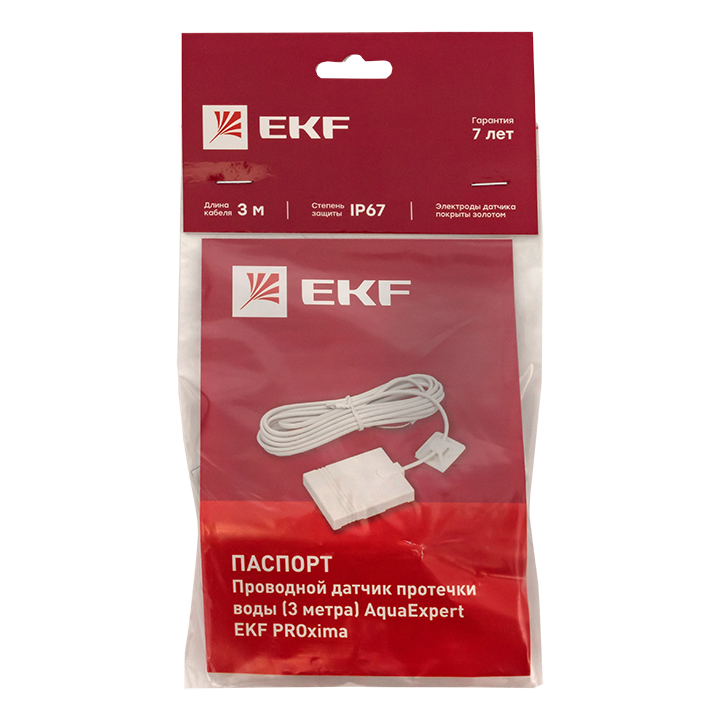 Проводной датчик протечки воды (3 метра) EKF предназначена для автоматического отключения подачи воды и выдачи звукового оповещения при возникновении протечек воды в системах водоснабжения, отопления и канализации. При попадании воды на датчик блок управления выдаст сигнал на шаровые электроприводы для отключения подачи воды.